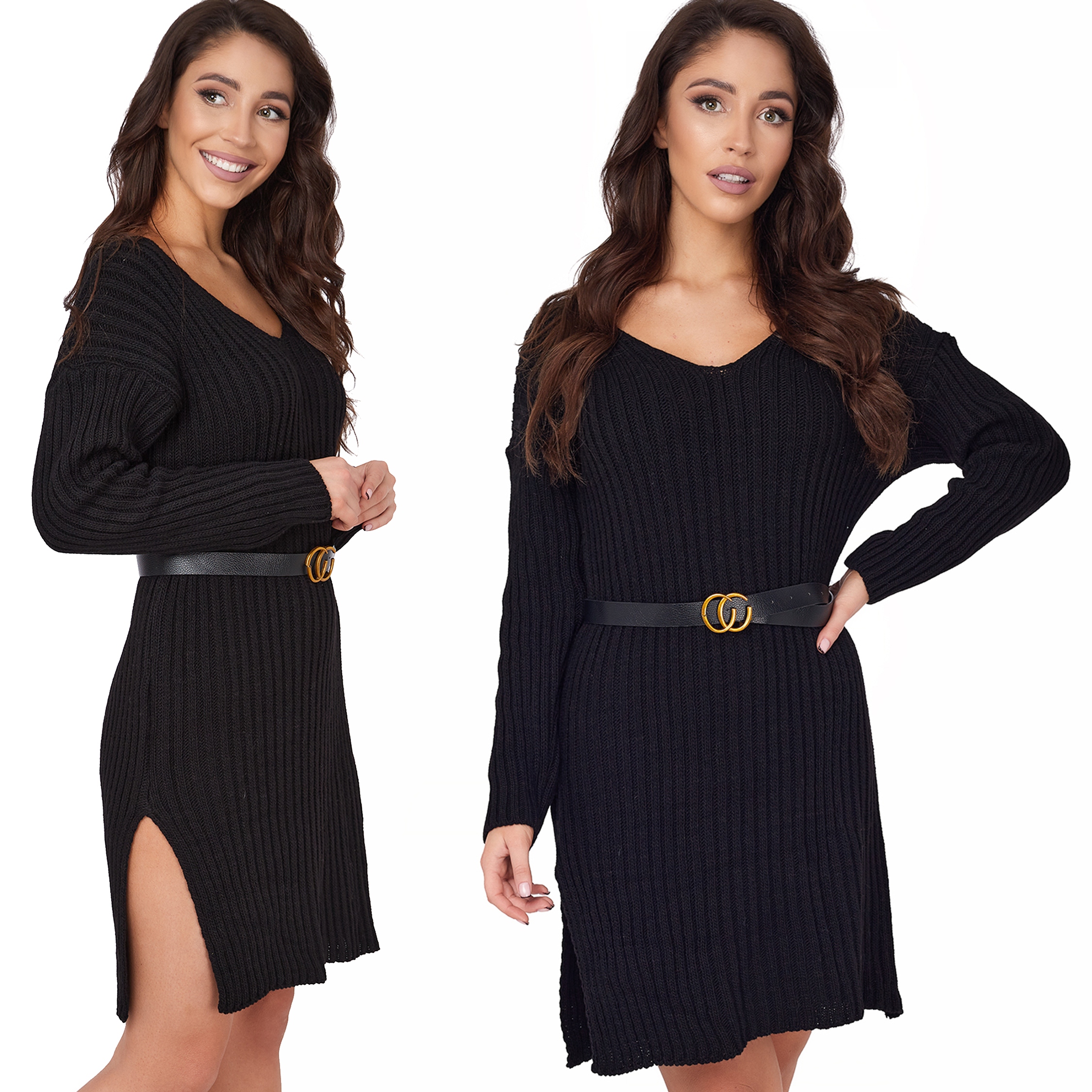 110_ XL/42 Prążkowana Sukienka W Serek z Paskiem