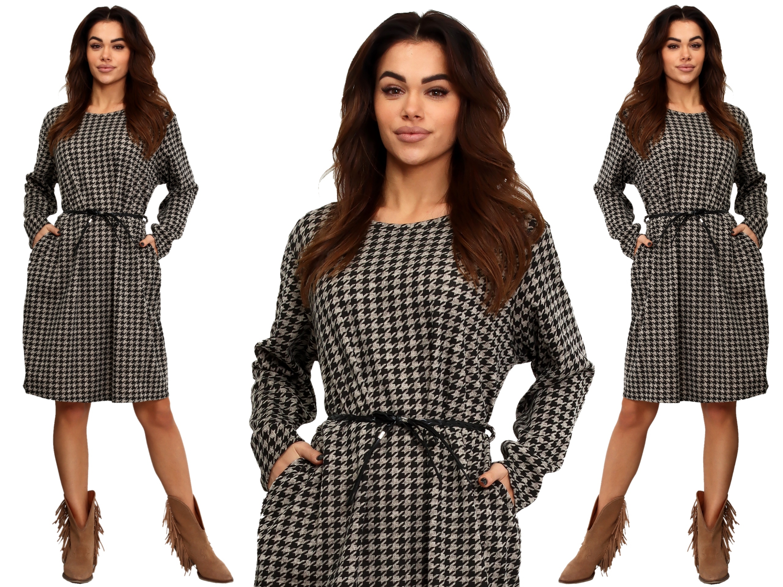 Sukienka z dzianiny Pepitka kieszenie Pasek R604