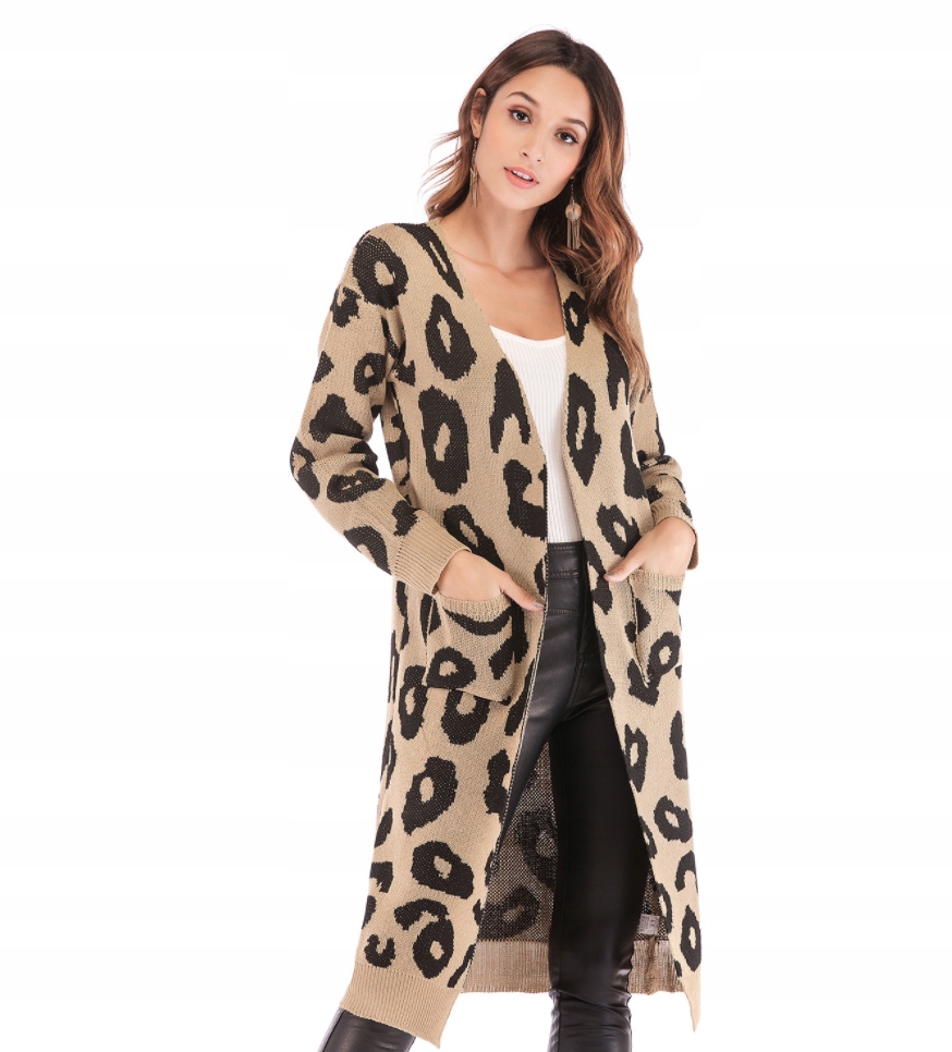 Sweter Damski Kardigan Długi Panterka Brązowy