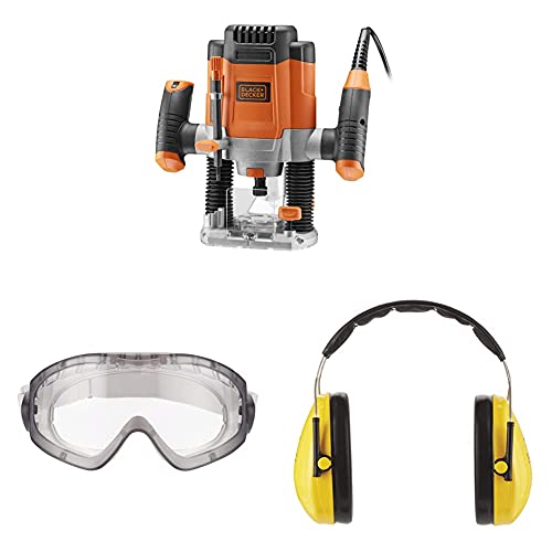 - Black+Decker 1.200W Oberfräse KW1200E, 38mm Fäserdurchmesser, inkl. 3M™ Schutzbrille für Werkzeugmaschinen 2890S, transparent und 3M™ Peltor™ Optime™ Komfort-Kapselgehörschutz H510A (87 bis 98 dB)