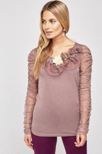 3D Flower Ruched Mesh Sleeve Top