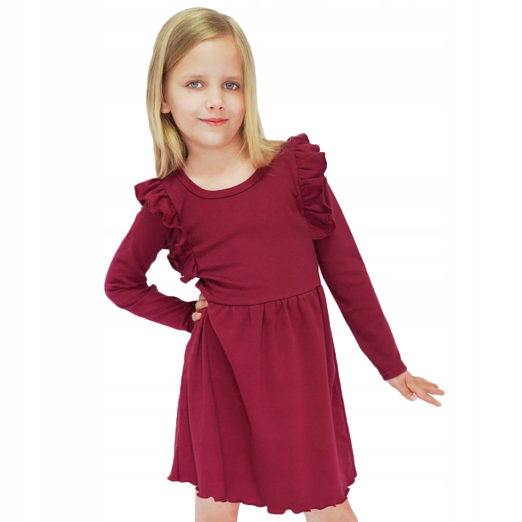 Bordowa Sukienka r.134 długi rękaw z falbankami