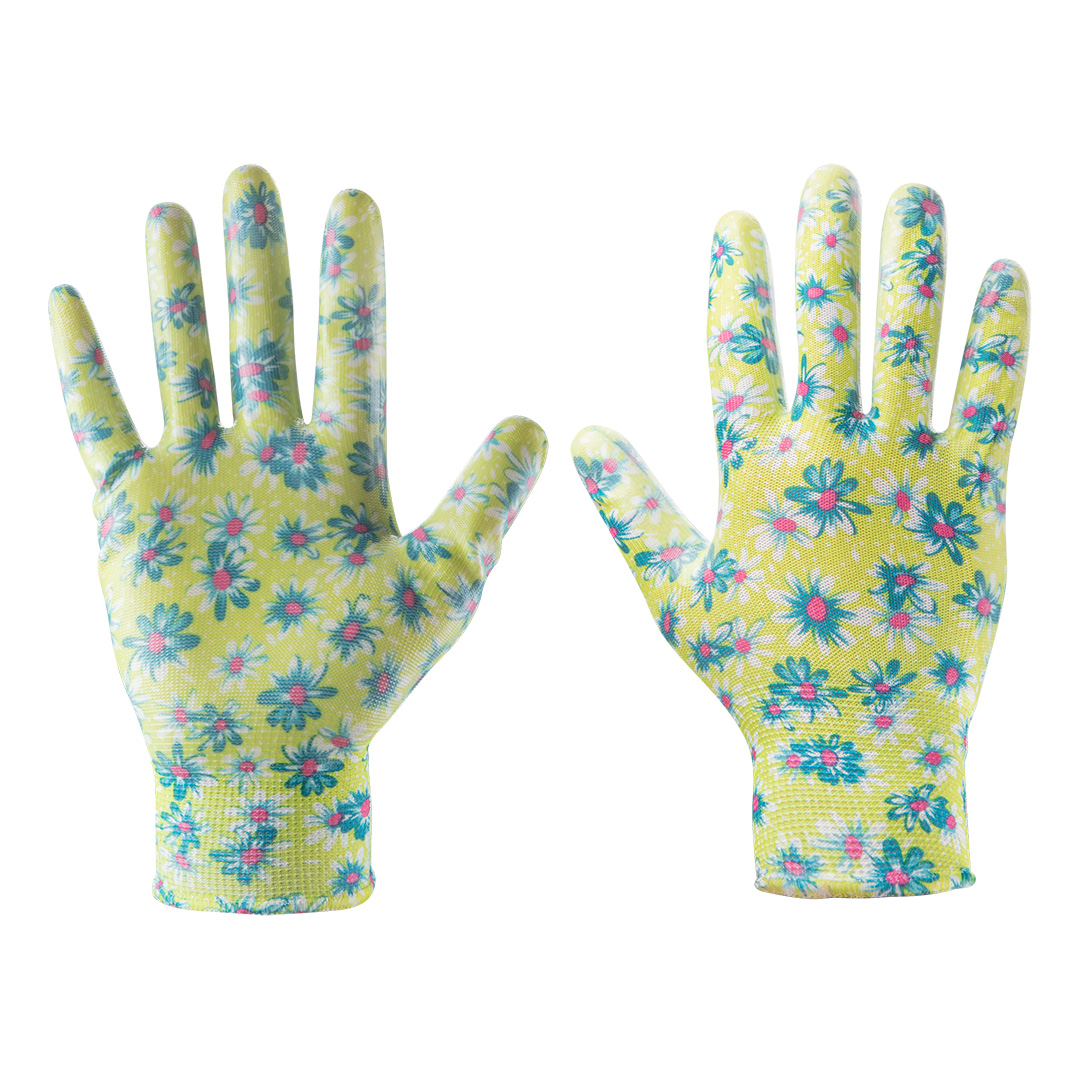 Rękawice ogrodowe pokryte nitrylem, wzór kwiatki,