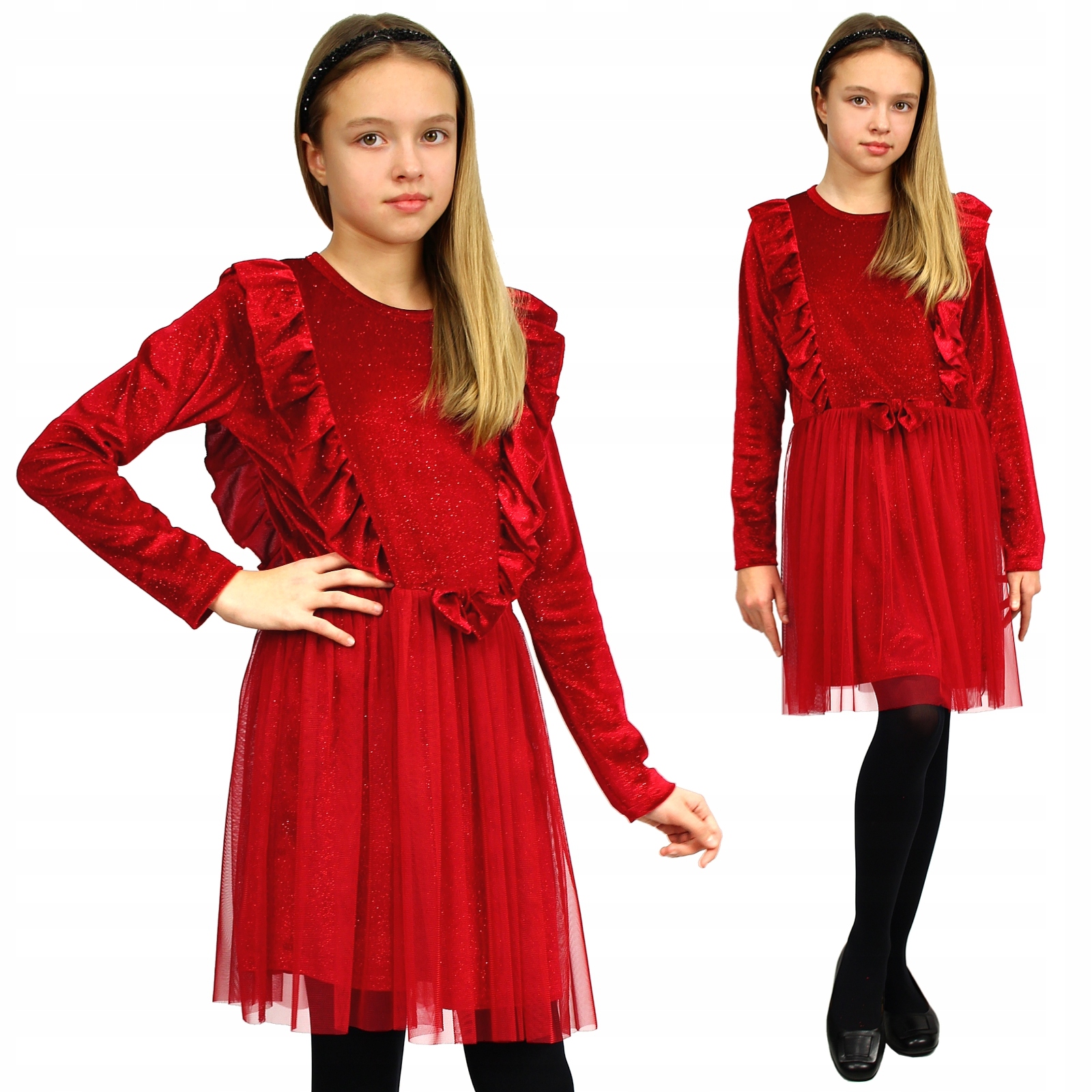 Sukienka Czerwona Welur Tiul Kokarda 152