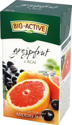 Producent marki Big-Active opisuje Herbatka owocowo-ziołowa o smaku grejpfrutowym z dodatkiem soku z acai, ekspresowa tak:Look bagtorebki przyjazne środowiskuZobacz kolorowe kompozycje suszonych owoców, ziół, płatków kwiatów i dodatków wewnątrz przezroczystej saszetki Look Bag. Na Twoich oczach susz rozwija się, odkrywając przed Tobą jakość i pełnię swojego smaku.Charakterystyka herbatki Midday SunMoc naparu ***Intensywność aromatu *****Goryczka ****Uroda ****To świeży napar o charakterystycznym, lekko gorzkawym smaku grejpfruta, który doskonale orzeźwia. Wzbogacony sokiem z jagód acai nabiera wyjątkowo cennych właściwości, które docenią zwłaszcza Panie dbające o gładką i jedwabistą skórę.Marka:Big-ActiveO marce:Power of Nature.O potędze natury mówimy, gdy objawia swoje destrukcyjne siły, zapominając często o jej pozytywnej mocy. Bo przyroda to nie tylko burze, tornada, wulkany i powodzie, ale także potężne drzewa rosnące przez setki lat, albo wytrwałe trawy, które z każdym rokiem zabierają kawałek pustyni? i piękna tęcza po wiosennym deszczu. Natura wypływa na nasze życie, inspiruje nas do działania, daje radość, siłę i wytchnienie od zgiełku współczesnego świata. Jeśli jej na to pozwolimy, troskliwie opiekuje się nami, żywi nas i chroni przed niebezpieczeństwem. Cierpliwie odkrywa przed nami swoje skarby i tajemnice, ofiarowując nam to, co ma najcenniejsze - moc ziół i owoców. Poznaj cudowną moc owoców acai, cierpkość aceroli i nieograniczone właściwości rokitnika czy topinamburu. Wykorzystaj tą hojność delektując się herbatami Power of Nature. Nazwa produktu uregulowana prawnie:Herbatka owocowo-ziołowa o smaku grejpfrutowym z dodatkiem soku z acai, ekspresowa.Pozostałe informacje:Znajdź nas na facebookuPoprzyj inicjatywę Duża ZielonaPrzechowywanie:Przechowywać w suchym miejscu w temp. pokojowej.Rodzaj opakowania:KartonKraj pochodzenia:UEAdres producenta:Wyprodukowano dla:Big-Active Sp. z o.o.ul. Bobrowiecka 600-728 WarszawaAdres zwrotny:Big-Active Sp. z o.o.ul. Bobrowiecka 600-728 Warszawa
