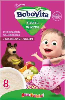 Producent marki BoboVita opisuje kaszka mleczna pełnoziarnista, z kolorowymi owocami, wielozbożowa tak:1000 pierwszych dni