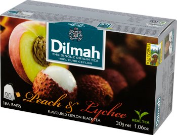 Producent marki Dilmah opisuje Cejlońska czarna herbata z aromatem brzoskwini i owocu liczi tak:DilmahO marce:Nazwa produktu uregulowana prawnie:Cejlońska czarna herbata z aromatem brzoskwini i owocu liczi.Pozostałe informacje:20 torebek ekspresowych z etykietką zapakowanych w folię dla zachowania świeżości.