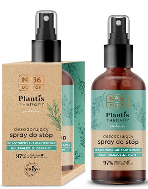 Producent marki Pharma opisuje No.36 Plantis Therapy Dezodorujący spray do Stóp, Szałwia tak:Aktywna esencja w lekkiej mgiełce skutecznie chroni przed nieprzyjemnym zapachem i nadmierną potliwością stóp. Zawiera kompleks naturalnych olejków o właściwościach antybakteryjnych oraz ekstrakty roślinne, które tonizują skórę i zapewniają długotrwałe uczucie świeżości.