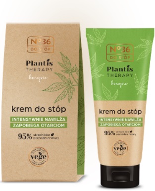 Producent marki Pharma opisuje No.36 Plantis Therapy Krem do stóp Konopie tak:Formuła roślinnego kremu przynosi natychmiastową ulgę szorstkiej i przesuszonej skórze. Dzięki zawartości naturalnych olejków krem intensywnie nawilża i wygładza skórę stóp, doskonale absorbuje wilgoć i nieprzyjemny zapach oraz chroni przed mechanicznymi otarciami naskórka.