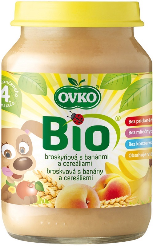Producent marki Ovko opisuje Ekologiczny deserek brzoskwinia,banan,zboża BIO tak:Pasteryzowany deserek owocowy bez dodatku cukru i soli, bez konserwantów ani składników pochodzących z mleka. Przygotowanie i stosowanie: SPOSÓB PRZYGOTOWANIA: Wymieszaj zawartość słoiczka. Podgrzej odpowiednią ilość do spożycia, upewnij się, że temperatura jest prawidłowa do podania. Nie podawaj ponownie podgrzanej, niedojedzonej porcji. Resztki poddane raz podgrzaniu należy zawsze wyrzucać. Przechowywać w suchym miejscu i chronić przed mrozem. Po otwarciu produkt przechowuj w zamkniętym słoiku w lodówce (maks. + 10 °C) nie dłużej niż 24 godziny. Wieczko bezpieczeństwa, przed użyciem upewnij się, że słoiczek nie został naruszony. Jeśli pokrywka przy otwarciu wyraźne nie "kliknie" nie należy spożywać zawartości. Brak wyraźnego "kliknięcia" i wypukłe wieczko bezpieczeństwa sygnalizuje nieszczelność opakowania. Kraj pochodzenia:Słowacja