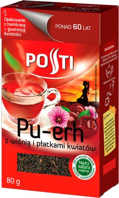 Producent marki Posti opisuje Pu-erh herbata czerwona liściasta aromatyzowana z wiśnią i płatkami kwiatów tak:Herbata Pu-erh znana już była w czasach chińskiej dynastii Tang. Z jej dobrodziejstw początkowo mógł korzystać jedynie cesarz i jego rodzina - herbata produkowana była w niewielkich ilościach. Dzisiaj każdy z nas może czerpać z niej to, co najlepsze.Czy wiesz, że...proces produkcji tej cennej herbaty był przez długie wieki objęty ścisłą tajemnicą. Legenda mówi, że pierwszy raz Pu-erh powstał wskutek zalania jaskini, w której były przechowywane liście herbaciane.Cechy:opakowanie z membraną - gwarancja świeżości, mądra natura inspiruje - 100% smaku, specjalnie wyselekcjonowane składnikiMarka:PostiO marce:PostiPonad 60 latNazwa produktu uregulowana prawnie:Pu-erh herbata czerwona liściasta aromatyzowana z wiśnią i płatkami kwiatów.Przechowywanie:Przechowywać w suchym i chłodnym miejscu, w szczelnie zamkniętym opakowaniu.Przygotowanie i stosowanie:Oderwij membranę i poczuj bogaty aromat herbaty.Sposób parzenia: Do czajniczka wsyp herbatę w proporcji 1 łyżeczka na 200 ml. Zalej świeżo zagotowaną wodą o temperaturze 98°C.Zaparzaj przez 3 do 5 minut.Rodzaj opakowania:KartonKraj pochodzenia:PolskaAdres producenta:POSTI S.A.ul. Bukowińska 22b02-703 WarszawaAdres zwrotny:POSTI S.A.ul. Bukowińska 22b02-703 Warszawa