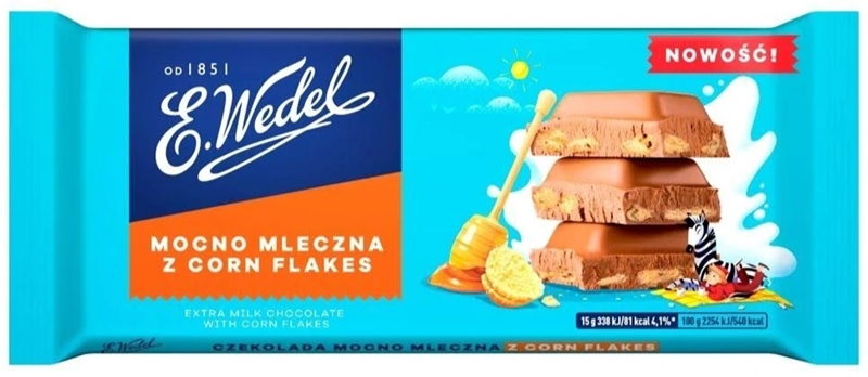Producent marki Wedel opisuje Czekolada mocno mleczna z płatkami kukurydzianymi z miodem tak:Wyjątkowe połączenie nowej, mocno mlecznej czekolady od E. Wedel i zatopionych w niej miodowych płatków kukurydzianych. To niecodzienne połączenie rozpływającej się w ustach mocno mlecznej czekolady i chrupiących corn flakes sprawi, że małe codzienne przyjemności staną się jeszcze bardziej przyjemne.Cechy:kakao z GhanyMarka:E. WedelNazwa produktu uregulowana prawnie:Czekolada mocno mleczna z płatkami kukurydzianymi z miodem.Pozostałe informacje:15 g 338 kJ/81 kcal 4,1%*