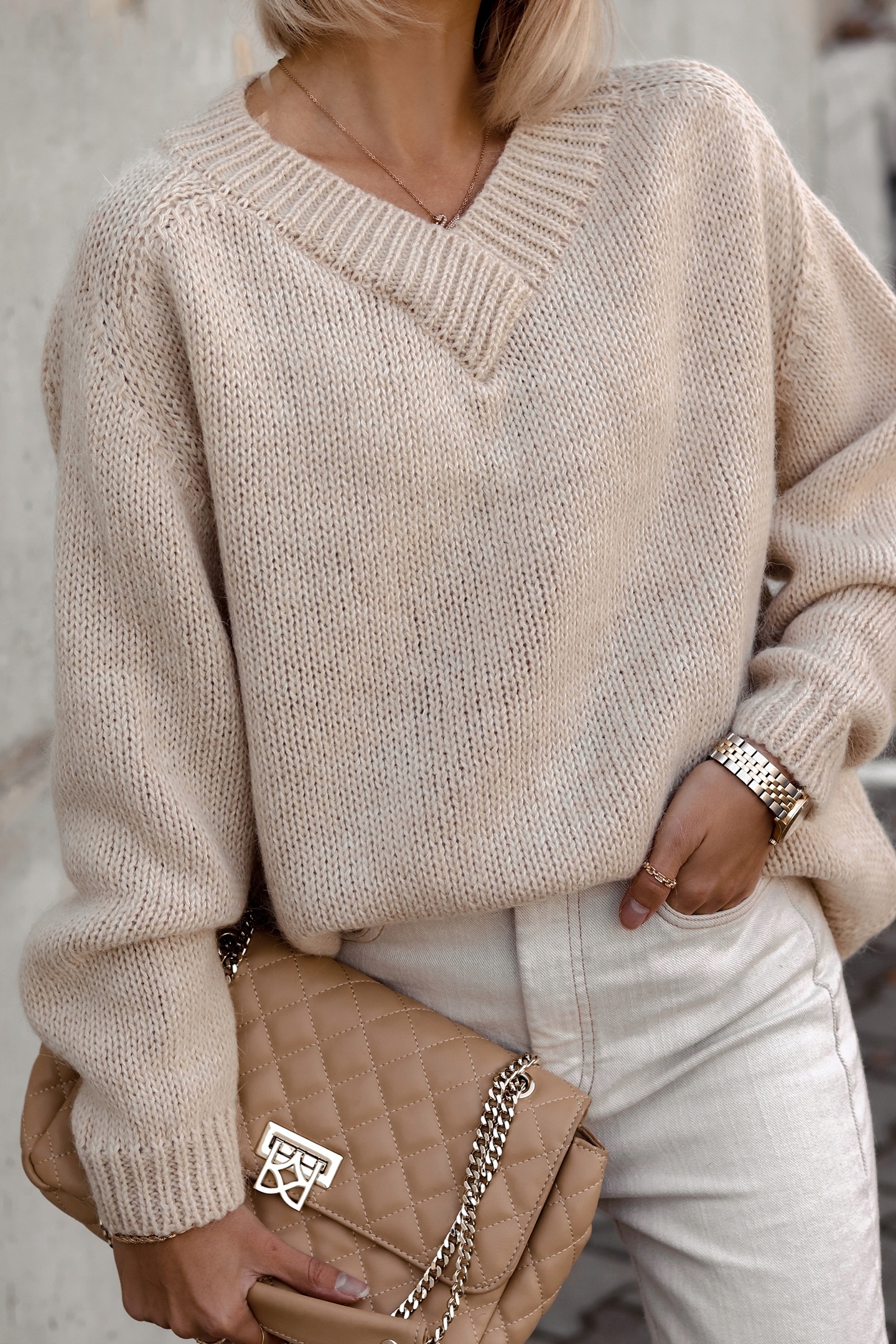 Sweter Wełniany Moher Beżowy Premium V-dekolt