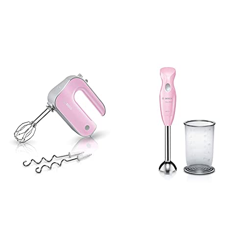 - Bosch Handrührer Styline MFQ4030K, 2 Rührbesen, 2 Edelstahl-Knethaken, spülmaschinengeeignet, 5 Stufen plus Turbostufe, 500 W, rosa/silber & MSM2410K Stabmixer, 400 W, Gentle Pink/Grau