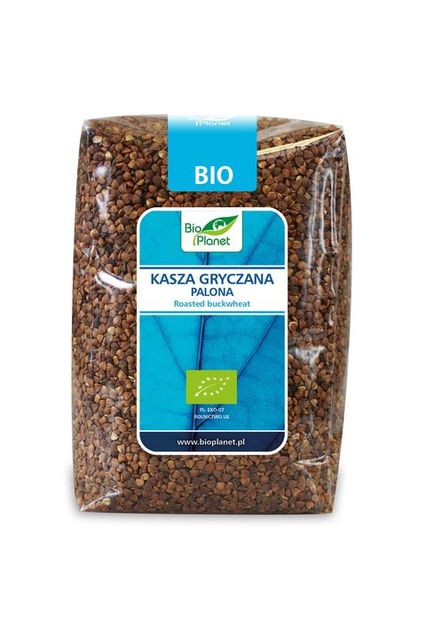Producent marki Bio Planet opisuje Kasza gryczana palona BIO tak:SKŁADNIKIkasza gryczana palona* 100% (*certyfikowany składnik ekologiczny) OPISEkologiczna kasza gryczana palona jest najczęściej stosowana jako składnik obiadów w połączeniu z warzywami lub gulaszem oraz jako dodatek do zup, dań jednogarnkowych i pasztetów. SPOSÓB PRZYGOTOWANIAKasza nie wymaga gotowania, wystarczy zalać ją wrzątkiem w proporcji 1:1 i trzymać pod przykryciem ok. 7 min. WARTOŚĆ ODŻYWCZA W 100 gWartość energetyczna - 1659 kJ / 392 kcalTłuszcz - 2,7 gw tym kwasy tłuszczowe nasycone - 0,6 gWęglowodany - 75 gw tym cukry - 2,6 gBiałko - 12 gSól - 0,03 g INFORMACJA ALERGENNAProdukt może zawierać alergeny: gluten, orzeszki ziemne i inne orzechy, sezam, soję. ZALECANE WARUNKI PRZECHOWYWANIAPrzechowywać w suchym i chłodnym miejscu.