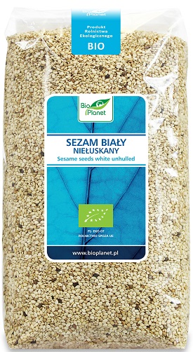 Producent marki Bio Planet opisuje Sezam biały niełuskany BIO tak:SKŁADNIKIsezam biały niełuskany* 100% (*certyfikowany składnik ekologiczny) OPISEkologiczny sezam biały niełuskany po uprażeniu może stanowić smaczny dodatek do sałatek, chleba i różnych dań. Może służyć również do domowego przygotowania tahiny - pasty sezamowej, doskonałej alternatywy dla masła bądź margaryny. Polecamy także w formie mielonej jako posypkę do kasz, ryżu, zup, czy warzyw gotowanych na parze. Nasiona sezamu powinny być mielone bezpośrednio przed spożyciem. Wcześniejsze namaczanie sezamu poprawia jego strawność. WARTOŚĆ ODŻYWCZA W 100 gWartość energetyczna - 2456 kJ / 594 kcalTłuszcz - 50 g,w tym kwasy tłuszczowe nasycone - 7,0 gWęglowodany - 12 g,w tym cukry - 0,3 gBiałko - 18 gSól - 0,03 g INFORMACJA ALERGENNAProdukt może zawierać alergeny: gluten, orzeszki ziemne i inne orzechy, soję. ZALECANE WARUNKI PRZECHOWYWANIAPrzechowywać w suchym i chłodnym miejscu.