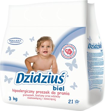 Producent marki Dzidziuś opisuje Hipoalergiczny proszek do prania pieluszek, bielizny oraz odzieży niemowlęcej i dziecięcej tak:Zawsze ufam mojej mamie...Specjalistyczny proszek Dzidziuś Biel przeznaczony jest do prania pieluszek, bielizny oraz odzieży niemowlęcej i dziecięcej we wszystkich zakresach temperatur. Bardzo skutecznie usuwa wszelkie zabrudzenia i dobrze się wypłukuje, co sprawia, że świetnie nadaje się także do ubrań całej rodziny. Staranie opracowany skład proszku sprawia, że Dzidziuś jest bezpieczny i łagodny dla skóry niemowląt i dzieci. Zawarte w proszku mydło efektywnie wspomaga usuwanie plam oraz nadaje tkaninom miękkość. Proszek Dzidziuś nie posiada enzymów, dzięki czemu jest w pełni bezpieczny dla Twojego dzidziusia.- zawiera delikatne mydło- teraz panie jeszcze bardziej miękkie- starannie opracowany skład proszku Dzidziuś jest łagodny dla skóry niemowląt i dzieci- doskonały również do prania ubrań całej rodziny- unikalna receptura - nie powoduje podrażnień- nie zawiera enzymów- subtelny, świeży zapach- polecany dla osób ze schorzeniami skórnymi z odczynem alergicznym- przebadany dermatologicznie- bezpieczny dla Twojego dziecka, Ciebie i środowiskaCechy:przebadany dermatologicznieOstrzeżenie dotyczące bezpieczeństwa:NIEBEZPIECZEŃSTWOPowoduje poważne uszkodzenia oczu. W razie konieczności zasięgnięcia porady lekarza należy pokazać pojemnik lub etykietę. Chronić przed dziećmi. Nie wdychać pyłu. Nie wprowadzać do oczu, na skórę lub odzież. Stosować okulary ochronne. W PRZYPADKU DOSTANIA SIĘ DO OCZU: Ostrożnie płukać wodą przez kilka minut. Wyjąc soczewki kontaktowe, jeżeli są i można je łatwo usunąć. Nadał płukać. W PRZYPADKU POŁKNIĘCIA: Natychmiast skontaktować się z OŚRODKIEM ZATRUĆ lub z lekarzem.Zawiera węglan sodu.Kontakt producenta w ww. zakresie: tel. kom. +48 795 567 622Marka:DzidziuśNazwa produktu uregulowana prawnie:Hipoalergiczny proszek do prania pieluszek, bielizny oraz odzieży niemowlęcej i dziecięcejPrzechowywanie:Przechowywać w suchym i chłodnym miejscu niedostępnym dla dzieci.Przygotowanie i stosowanie:Podczas prania należy przestrzegać instrukcji podanych przez producentów odzieży.Zalecenia: Wszelkie stałe zanieczyszczenia na pieluszkach należy spłukać zimną wodą. Przy praniu ręcznym pieluszek i bielizny niemowlęcej należy kilkakrotnie i starannie płukać. Dozować zgodnie ze sposobem użycia.Rodzaj opakowania:ZgrzewaneAdres producenta:„POLLENA\" Przedsiębiorstwo Chemii Gospodarczej Spółka z ograniczoną odpowiedzialnością Sp. k.ul. Powstańców Wlkp. 1663-500 OstrzeszówAdres zwrotny:„POLLENA\" Przedsiębiorstwo Chemii Gospodarczej Spółka z ograniczoną odpowiedzialnością Sp. k.ul. Powstańców Wlkp. 1663-500 Ostrzeszówtel. (+48 62) 732 32 30
