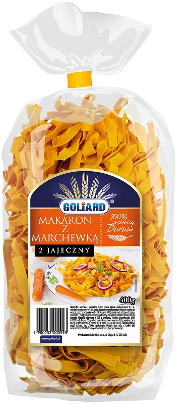 Producent marki Goliard opisuje Makaron wstążki z marchewką tak:Makaron ten produkowany jest z najwyższej jakości mąk z pszenicy durum z dodatkiem odpowiednio sproszkowanej naturalnej marchewki, wody oraz 2 jaj na kg mąki. Marchew to warzywo, o którego właściwościach leczniczych i wartościach odżywczych decydują witaminy, minerały i przeciwutleniacze. Wśród tych ostatnich jednym z ważniejszych jest beta-karoten, który nie tylko wzmaga opaleniznę, lecz także zapewnia prawidłowe funkcjonowanie wzroku, wzmacnia odporność i może ochronić przed rozwojem nowotworów.