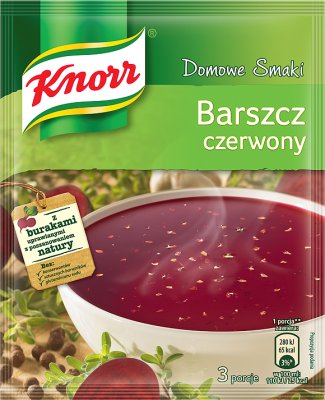 Producent marki Knorr opisuje Barszcz czerwony tak:To jedna z nielicznych zup, która pasuje niemal do każdego dania. Jest obecna na Wigilijnym stole, stała się pozycją obowiązkową na wielu weselach, codziennie gości na stołach tysięcy polskich rodzin. Można ją podawać z uszkami, z krokietami lub samodzielnie. Jest także świetną bazą do przygotowania chłodniku. I jak tu jej nie lubić?Cechy:z burakami uprawianymi z poszanowaniem natury, bez: konserwantów, sztucznych barwników, glutaminianu soduMarka:KnorrO marce:Doskonały smak leży w naszej naturzeDlatego w skład produktów Knorr wchodzą najlepsze warzywa, zioła lub przyprawy uprawiane z poszanowaniem natury. Zbieramy je wtedy, gdy są odpowiednio dojrzałe i suszymy tak, by zachować ich naturalny smak i aromat.Nazwa produktu uregulowana prawnie:Barszcz czerwonyPozostałe informacje:1 porcja** zawiera: 280 kJ 65 kcal 3%*w 100 ml: 110 kJ / 25 kcal* % referencyjnej wartości spożycia dla przeciętnej osoby dorosłej (8400 kJ / 2000 kcal).**1 porcja = 250 ml. Opakowanie wystarcza do przygotowania 3 porcji zupy.Przechowywanie:Przechowywać w suchym, chłodnym i zaciemnionym miejscu.Przygotowanie i stosowanie:Sposób przygotowania:1. Zawartość torebki wsyp do 750 ml gorącej wody.2. Dokładnie wymieszaj. Nie gotuj.Rada szefa kuchni Knorr: Barszcz możesz podać z krokietami lub pierogami. Jeśli chcesz nadać zupie ostrzejszego smaku, dodaj kilka kropel soku z cytryny i kilka rozdrobnionych ziaren pieprzu.Rodzaj opakowania:TorebkaAdres producenta:Unilever Polska Sp. z o.o.Al. Jerozolimskie 134 02-305 WarszawaAdres zwrotny:Unilever Polska Sp. z o.o.skr. poczt. 31500-987 Warszawa 4 \"Knorr\"Infolinia: 801 109 387 całkowity koszt połączenia: 1 impuls wg taryfy operatora