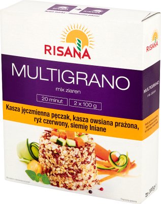 Producent marki Risana opisuje Kasza jęczmienna pęczak, kasza owsiana prażona, ryż czerwony, siemię lniane tak:Mix ziaren z siemieniem lnianym to unikalne połączenie starannie wyselekcjonowanych składników, cenionych ze względu na wartości odżywcze. Produkt charakteryzuje się wysoką zawartością błonnika pokarmowego i magnezu oraz niską zawartością cukrów. To również źródło białka oraz minerałów pochodzenia naturalnego: żelaza, cynku i potasu. Mieszanka stanowi niezwykłe połączenie smaku i konsystencji. Orzechowa nuta ryżu czerwonego w połączeniu z charakterystyczną chrupkością siemienia lnianego idealnie komponuje się zarówno z daniami tradycyjnymi, jak i bardziej wykwintnymi. Świetnie sprawdza się z potrawami mięsnymi, warzywami, a dzięki niezwykłym walorom estetycznym, również jako składnik oryginalnych sałatek.Cechy:- Niebanalne połączenia zbóż od Matki Natury