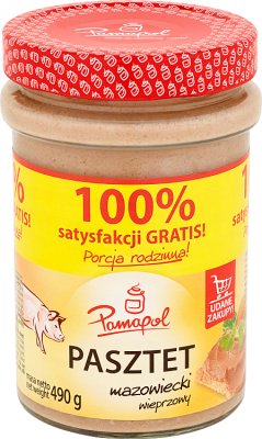 Producent marki Pamapol opisuje Pasztet wieprzowy z białkiem mleka, sterylizowany tak:100% satysfakcji gratis!, porcja rodzinna!, udane zakupy!Marka:PamapolO marce:Pamapol