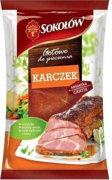 Producent marki Sokołów opisuje Gotowe do pieczenia Karczek tak:Doskonale zamarynowane mięso karczku z przyprawami ziołowymi.