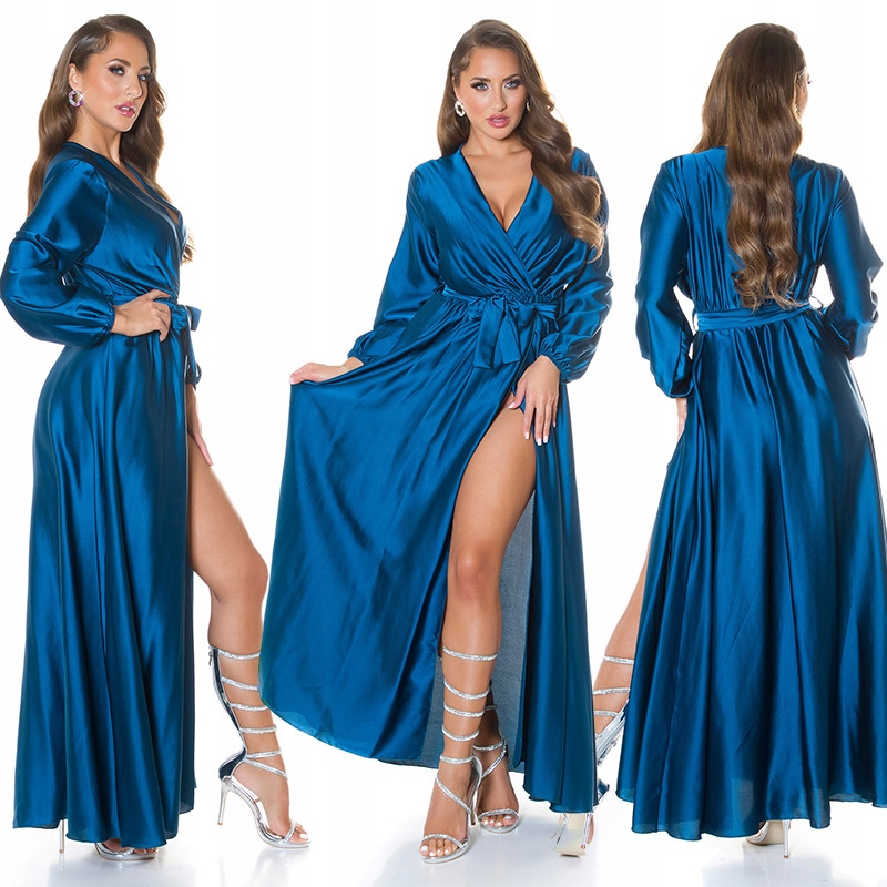 Satynowa Petrol Suknia Wieczorowa Długa Maxi Uni