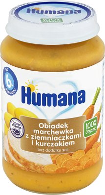 - Humana 100% Organic obiadek marchewka z ziemniakami i kurczakiem, po 6. miesiącu, 190 g