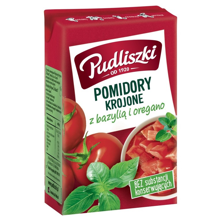 - Pudliszki Pomidory krojone z bazylią i oregano 390 g