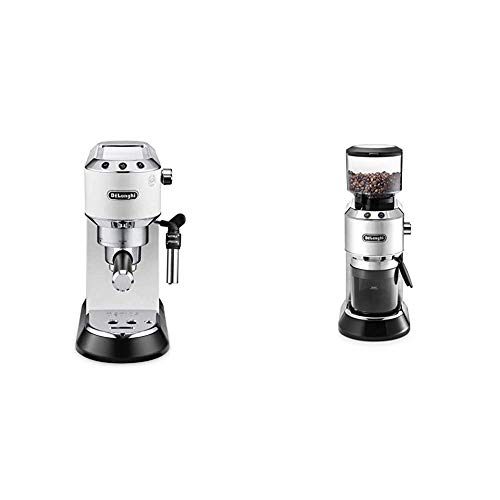 - De’Longhi Dedica EC 685.W Espresso Siebträgermaschine | 15 bar | Professionelle Milchschaum Düse| Füllmenge 1 l | Vollmetallgehäuse | Weiß + KG 520.M Elektrische Kaffeemühle, silber