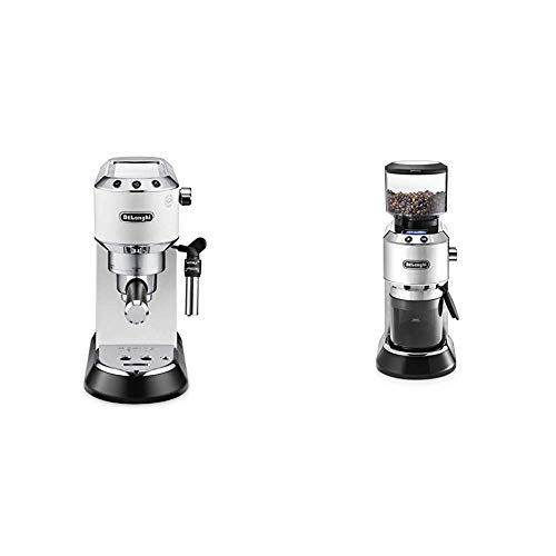 - De’Longhi Dedica EC 685.W Espresso Siebträgermaschine | 15 bar | Professionelle Milchschaum Düse| Füllmenge 1 l | Vollmetallgehäuse | Weiß + KG 521.M Elektrische Kaffeemühle, silber